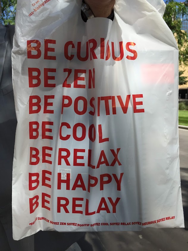 Paris might very well be the world capital of all things French, yet the majority of bags that one finds on its streets have inspirational messages written in English. Granted, that is the case for the bags that I see and the messages that resonate with me. On one occasion, the girl carrying the bag did not seem to know what the words in English meant (see bag no. 9 below). She must have paid little attention to the message, the bag merely being a tool for her. She even admitted that she was "nulle" in English. Fortunately, I was able to convey the message after translation. "Ah, c'est beau", she said.